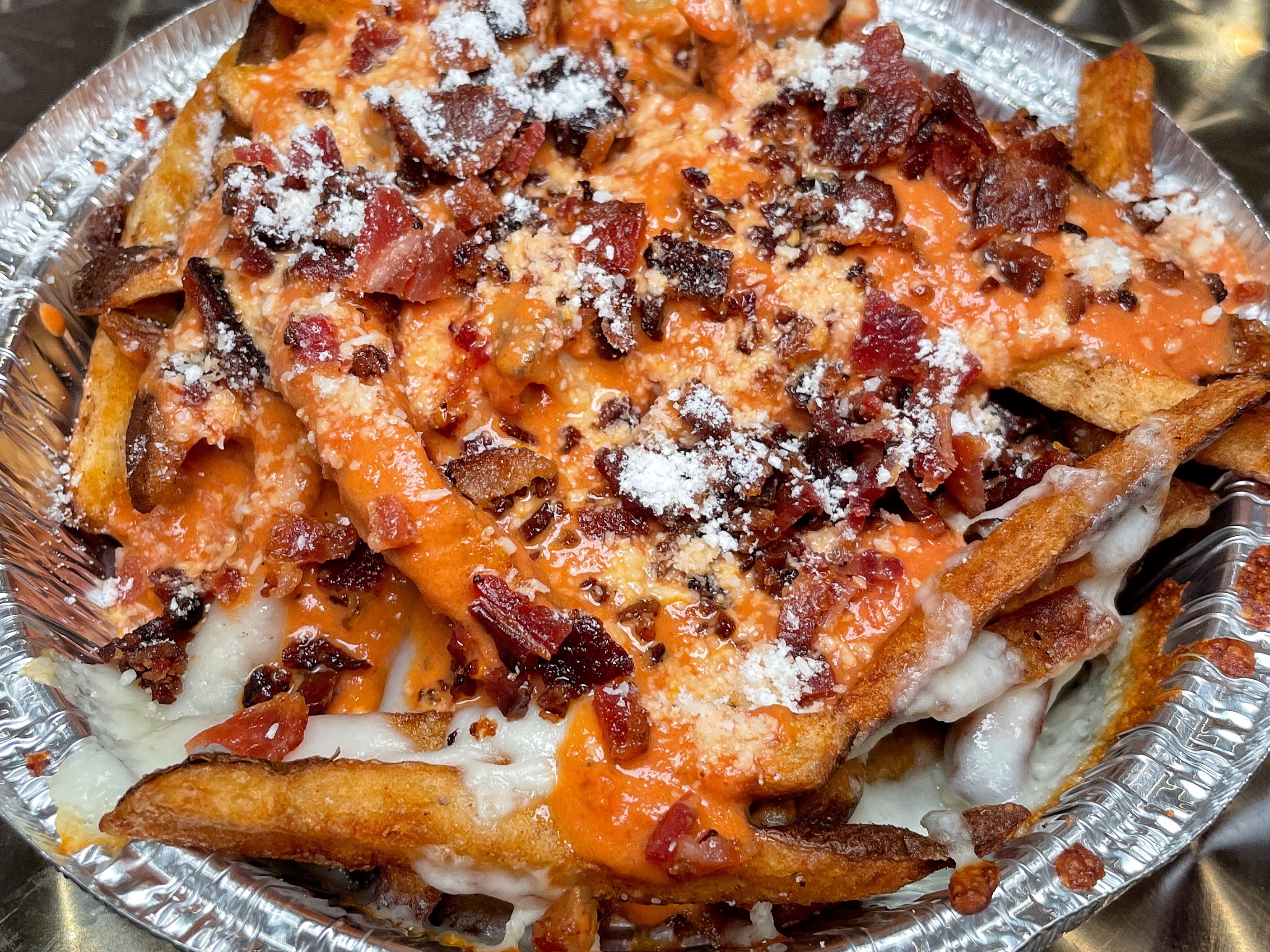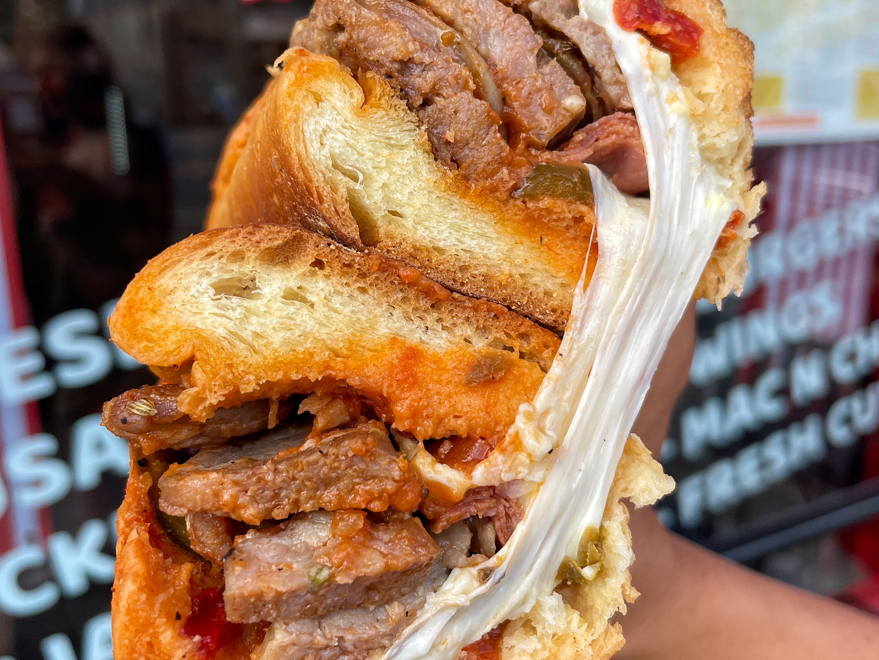 Ribeye, Fried Chicken, Bacon, French Fries, Mozzarella, Cheese Wiz, Gravy, Toasted Garlic Bread