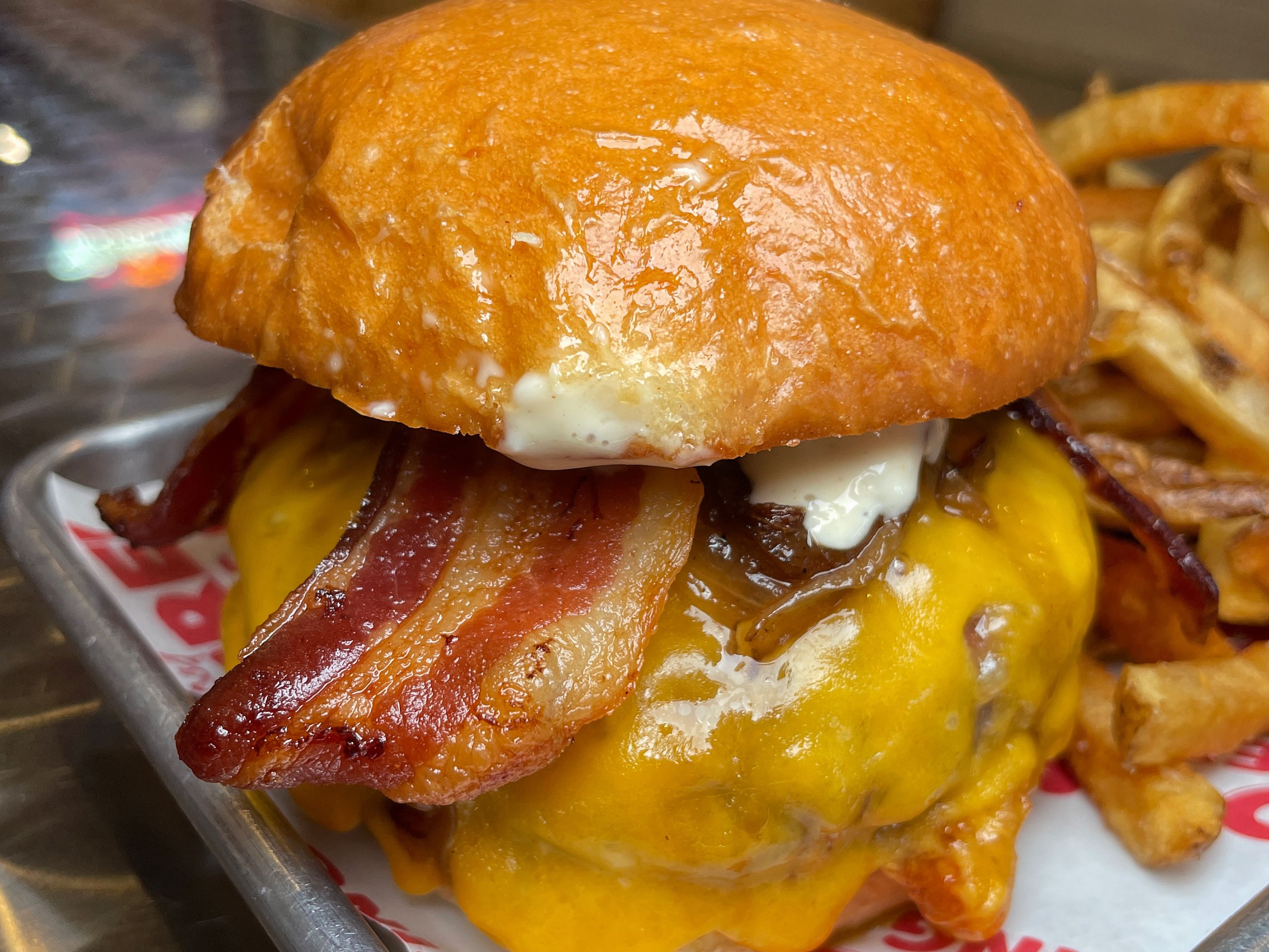 Burger, Double Bacon, American, Cheddar, Mayo, Torta Bun