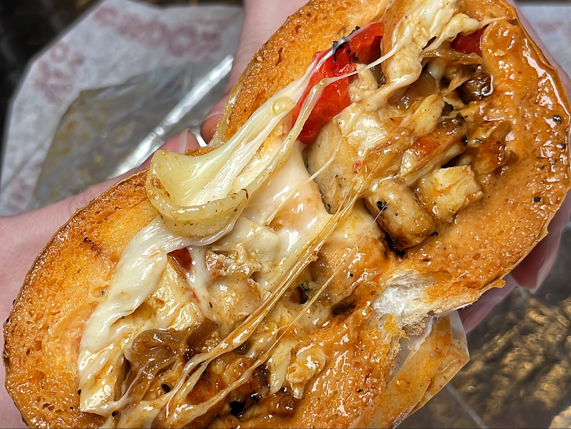 Chopped grilled chicken, cheese whiz, caramelized onions, roasted peppers, hero