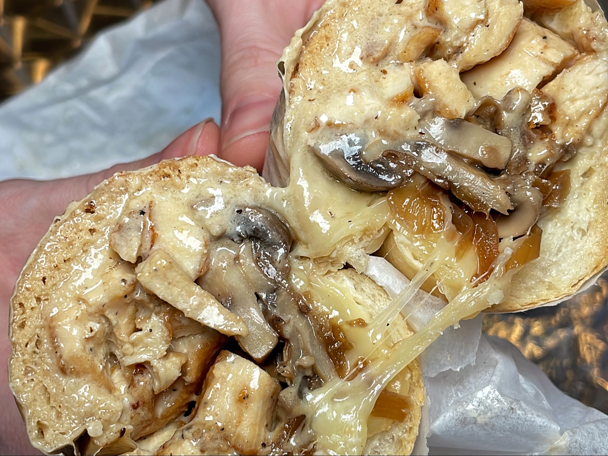 Chopped grilled chicken, Swiss, mushrooms, caramelized onions, horseradish aioli, hero