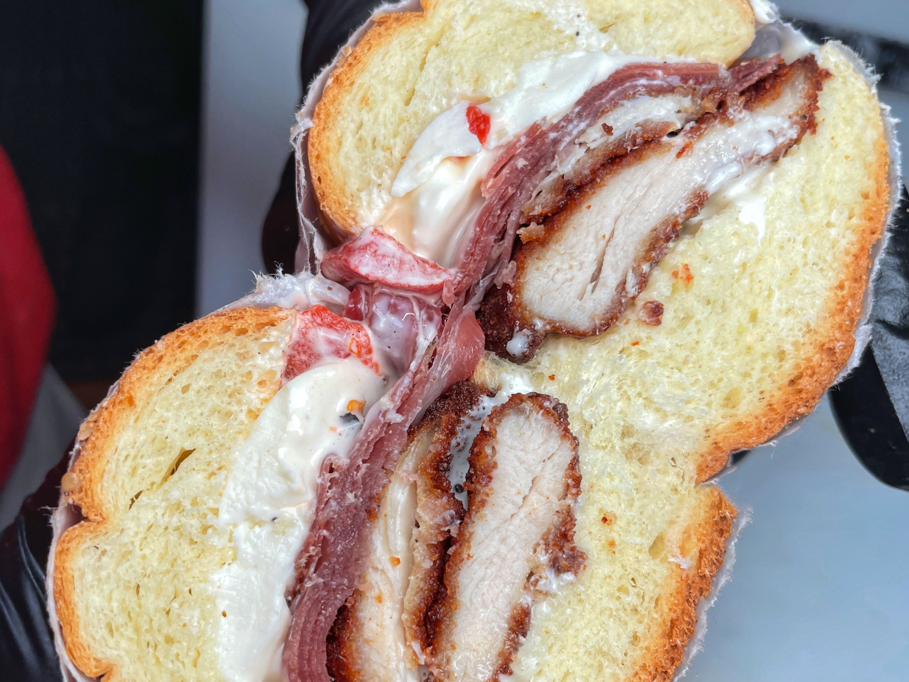 Fried Chicken Cutlet, Capicola, Fresh Mozzarella, Roasted Peppers, Garlic Aioli, Seeded Semolina