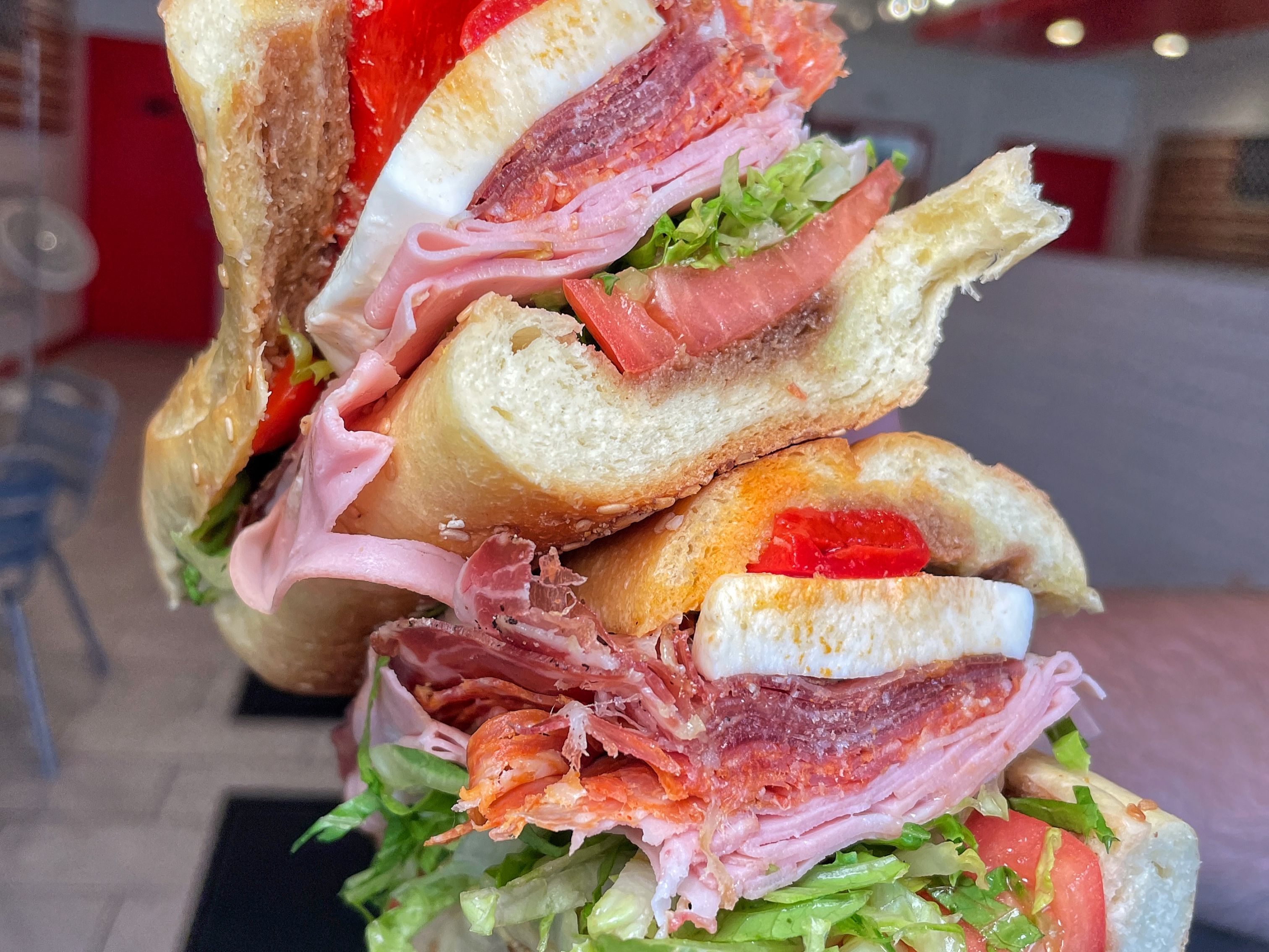 Cappicola, Soppressata, Mortadella, Fresh Mozzarella, Roasted Peppers, Lettuce, Tomato, Virgin Olive Oil and Balsamic Vinegar, Seeded Semolina